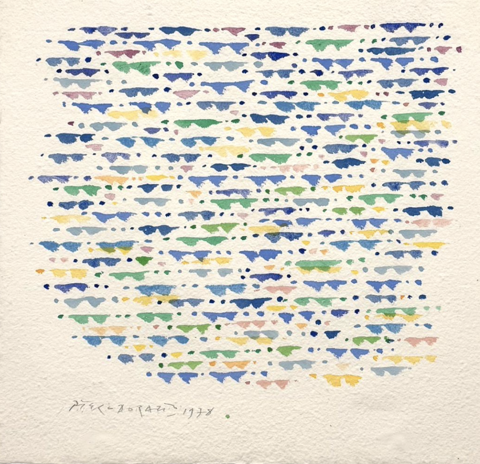 Dieses Aquarell von 1978 zeigt eine serielle, rhythmisch strukturierte Komposition aus kleinen, horizontal angeordneten Farbsegmenten. In dichter Reihung entstehen vibrierende Farbfelder aus Blau-, Grün-, Gelb- und vereinzelten Rosétönen. Die einzelnen Formen wirken wie modulare Bausteine, die in ihrer Wiederholung ein visuelles Geflecht bilden. Trotz der seriellen Struktur bleibt jede Form leicht variierend – ein Wechselspiel aus Ordnung und lebendiger Abweichung.