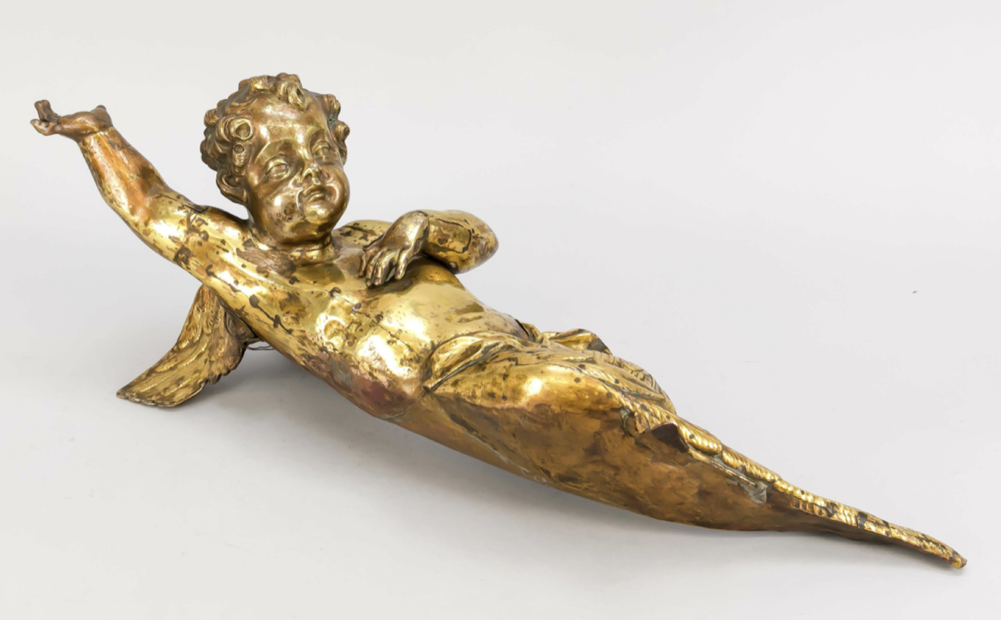 Dieser vollplastische Schwebeengel aus getriebenem Kupferblech, entstanden im 17. oder 18. Jahrhundert, ist ein eindrucksvolles Zeugnis barocker Sakralkunst. Frei schwebend konzipiert, war er ursprünglich als sichtbares Bindeglied zwischen irdischem Kirchenraum und himmlischer Sphäre gedacht. Derartige Putten prägten das Raumbild vieler Kirchen und verliehen dem liturgischen Geschehen eine spürbare Transzendenz.