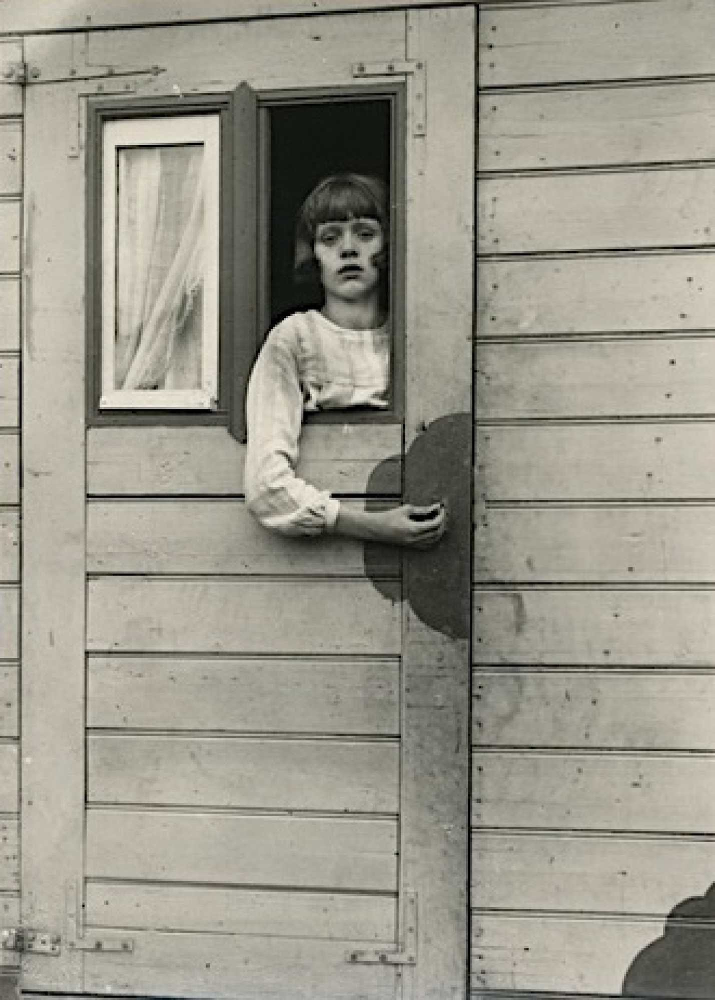 Die Fotografie zeigt ein junges Mädchen, das aus dem Fenster eines Zirkuswagens blickt. Ihr direkter, zugleich nachdenklicher Blick erzeugt eine stille, beinahe intime Verbindung zum Betrachter. Die enge Bildkomposition, gerahmt durch das Fenster, verstärkt dieses Gefühl von Nähe und Konzentration.