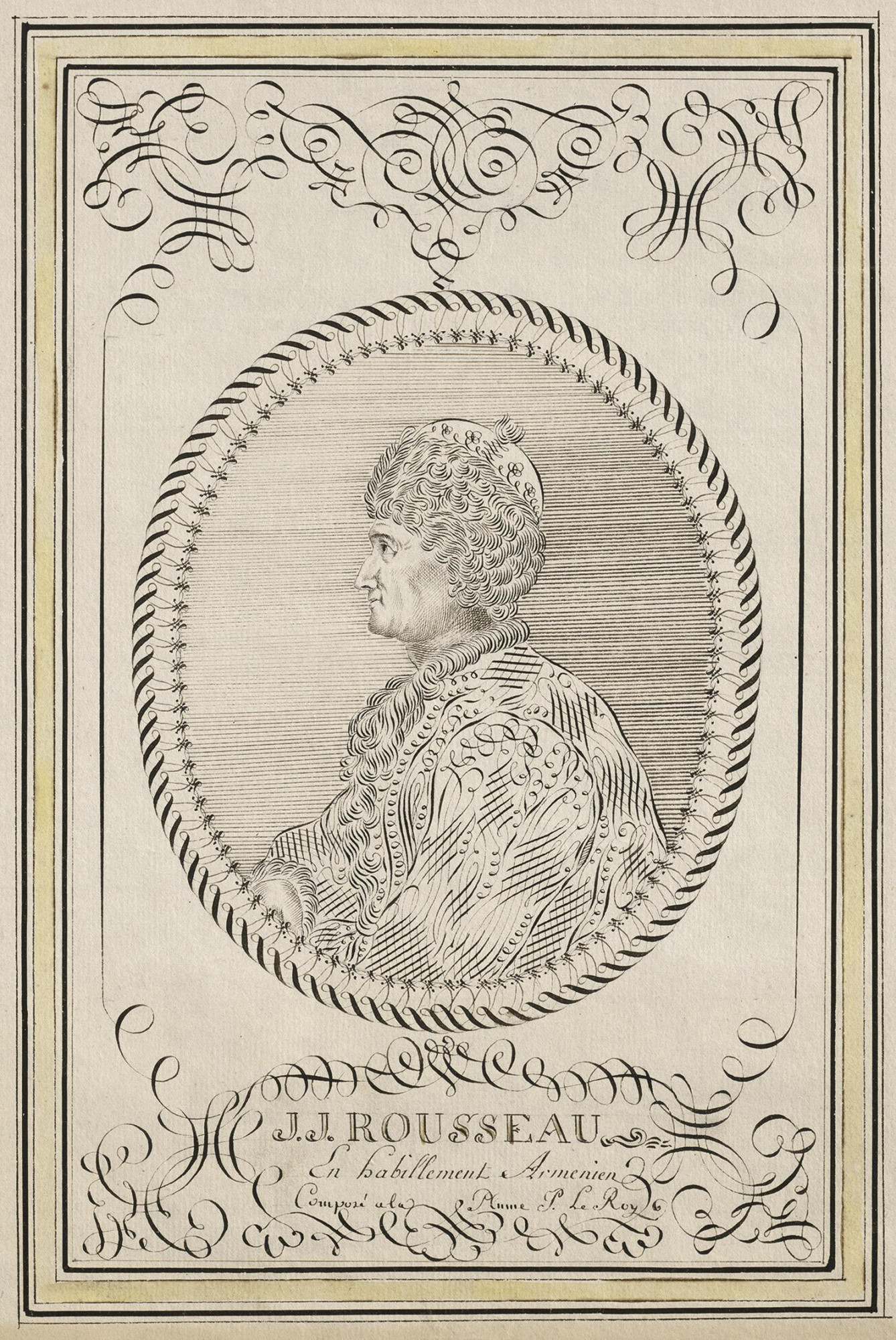 Die hier gewählte Darstellung greift diesen biografischen Wendepunkt auf. Rousseau erscheint als Schriftsteller und Denker, zugleich als Figur des Protests. Das armenische Gewand steht für seine Kritik an einer als verdorben empfundenen Zivilisation. Die kalligrafische Ausarbeitung unterstreicht den intellektuellen Anspruch des Motivs und verleiht dem Blatt einen repräsentativen Charakter. Das Werk verbindet somit Porträt und kulturhistorisches Dokument, es reflektiert die Spannung zwischen Aufklärung und Macht, Individualität und Ordnung.