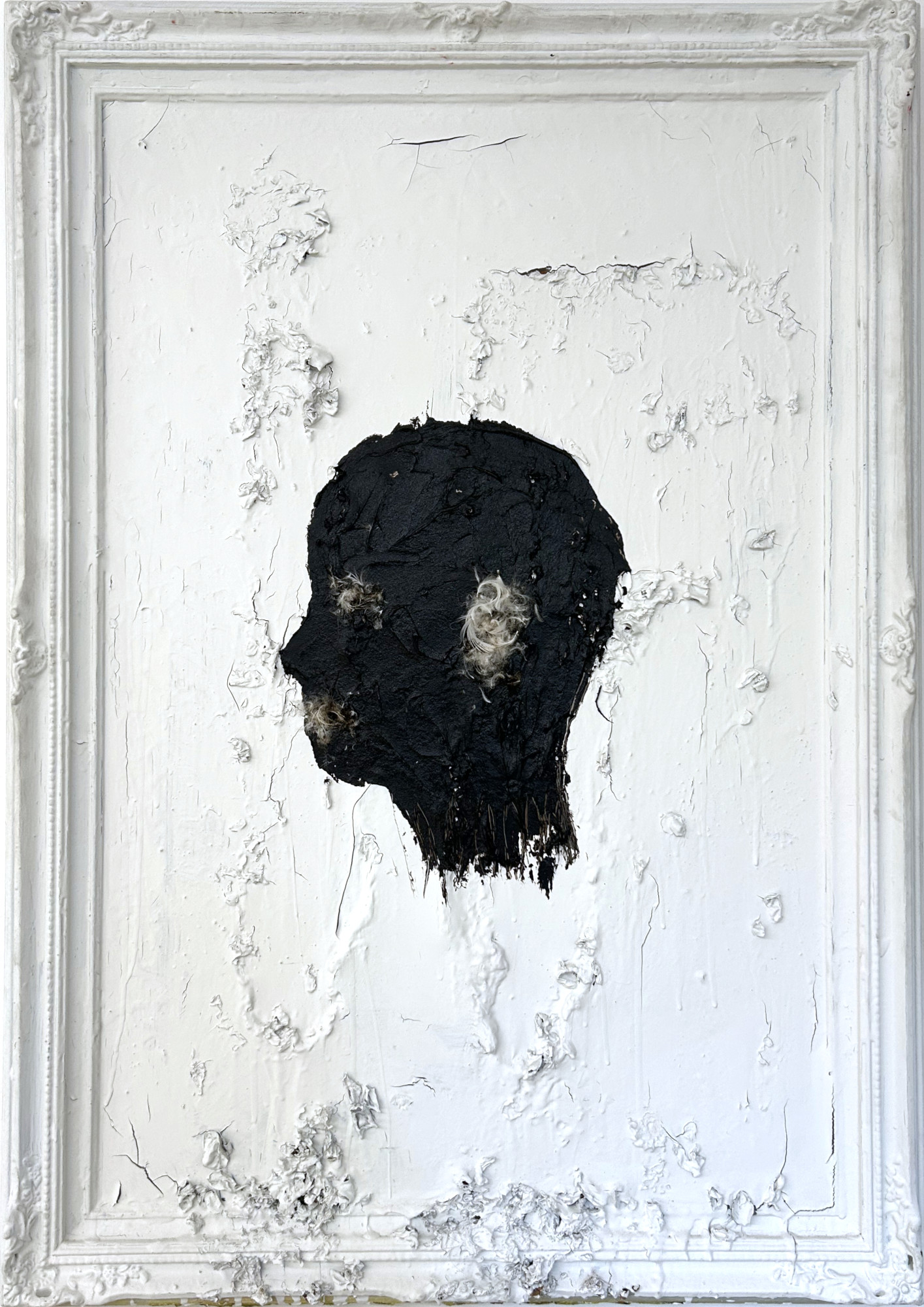 Zentrales Element der Komposition ist ein schemenhaft dargestellter Kopf, der aus der Oberfläche hervorzutreten scheint. Diese Figur ist weder porträthaft noch eindeutig identifizierbar, sondern bewegt sich zwischen Figuration und Abstraktion. Der Kopf fungiert weniger als individuelles Subjekt denn als Bildzeichen für Bewusstsein und Wahrnehmung. Eingebettet in die materiellen Schichtungen wirkt er zugleich präsent und instabil, als Teil eines offenen Denk- und Erinnerungsraums.